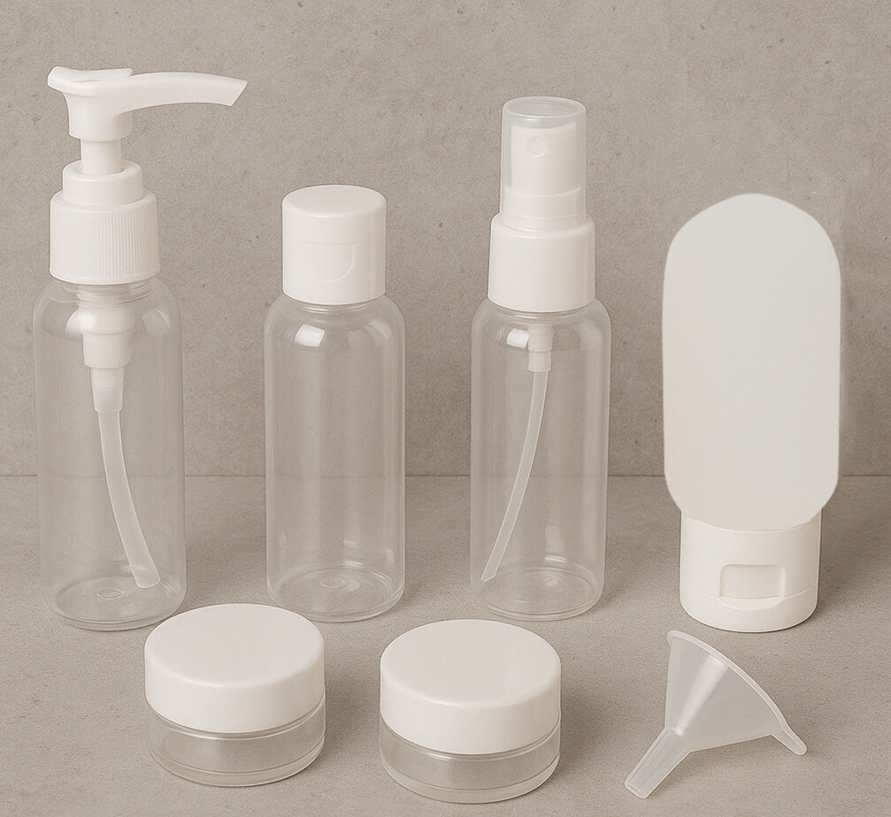 Set de viaje con 8 accesorios: 1 atomizador, 1 bote con dispensador, 2 botes con tapa Disc Top, 1 bote, 1 recipiente para almacenamiento, 1 mini embudo y 1 palita. Incluye estuche.