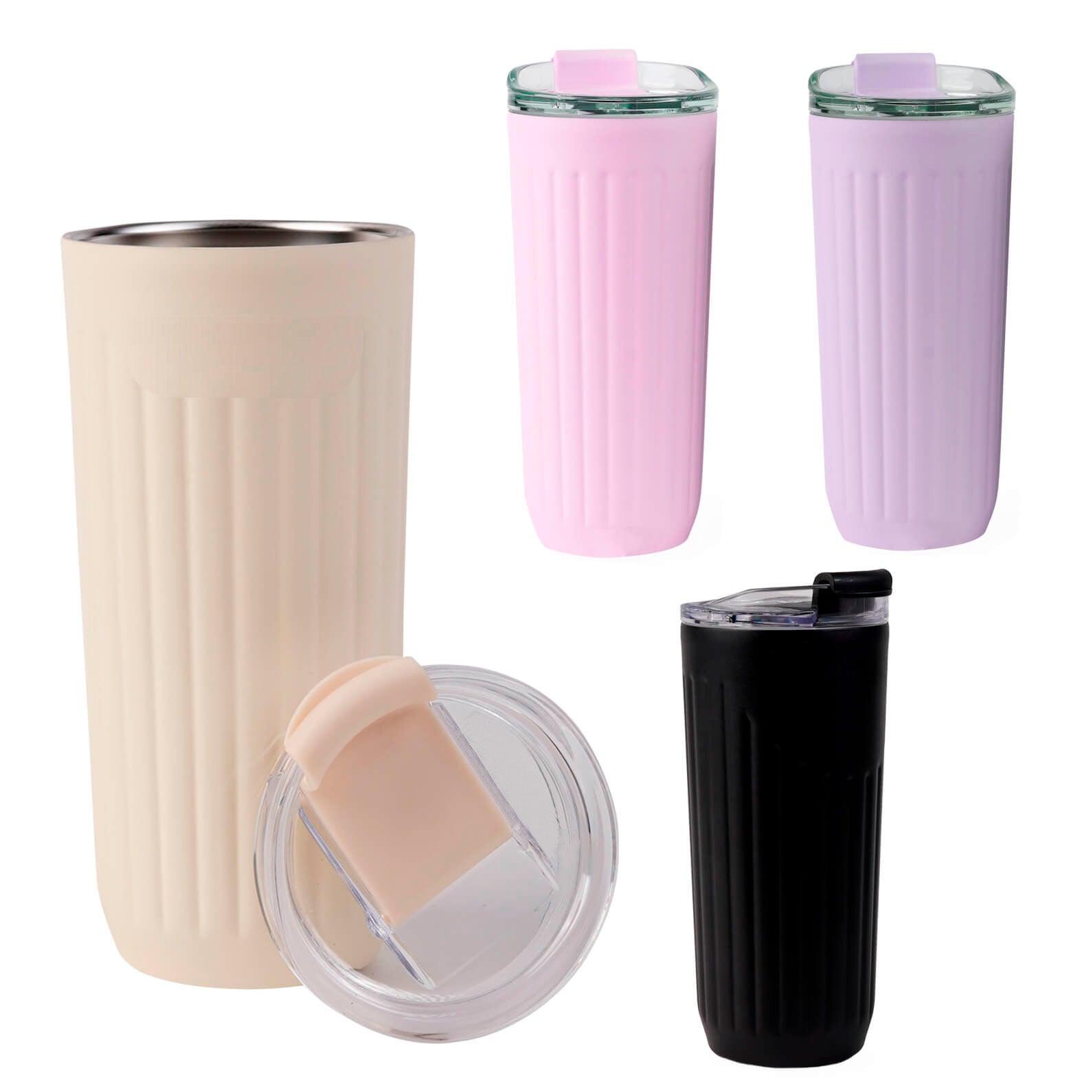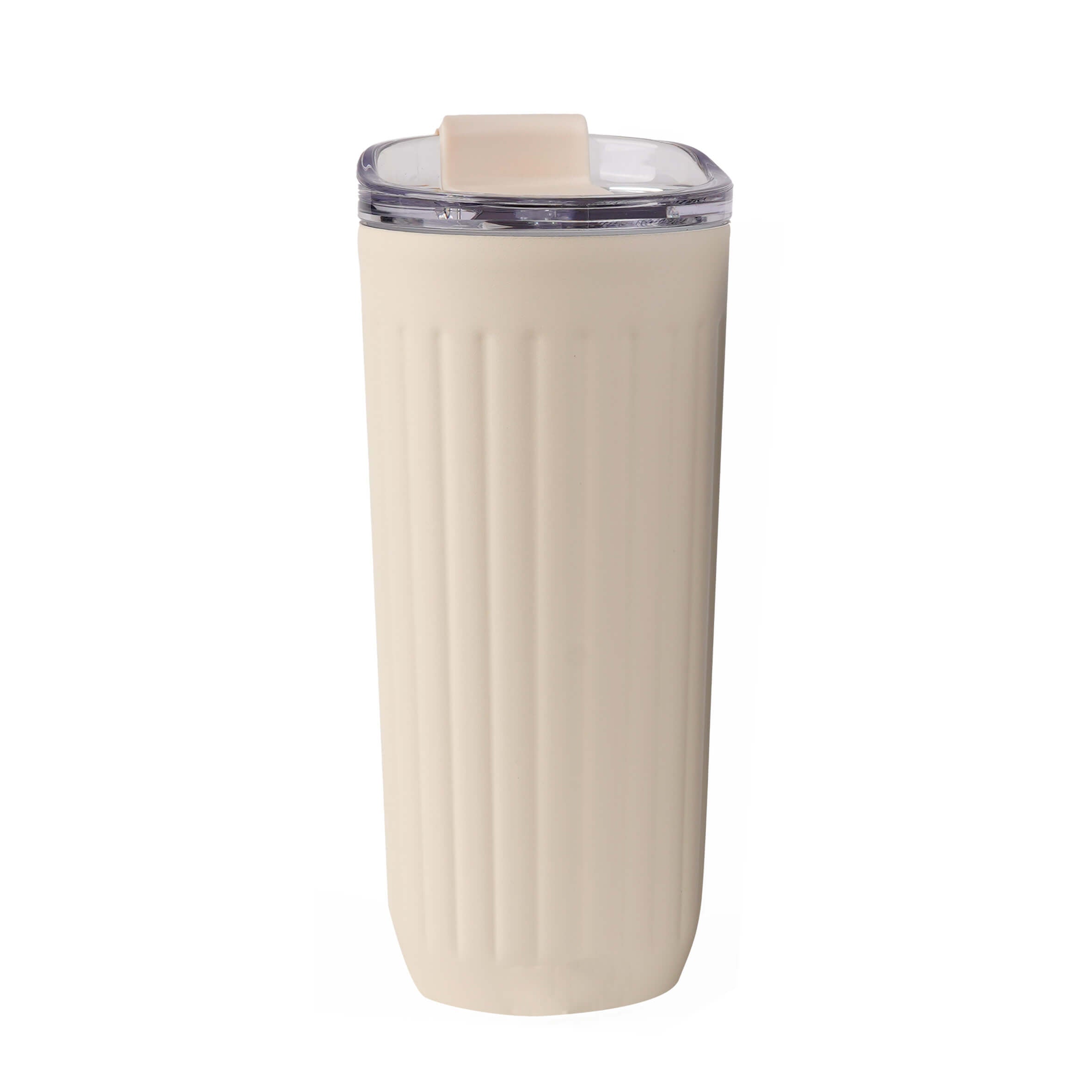 Termo con doble pared de acero inoxidable con acabado rugoso, insaldao al vacio, tapa que cierra a presión y boquilla de seguridad.