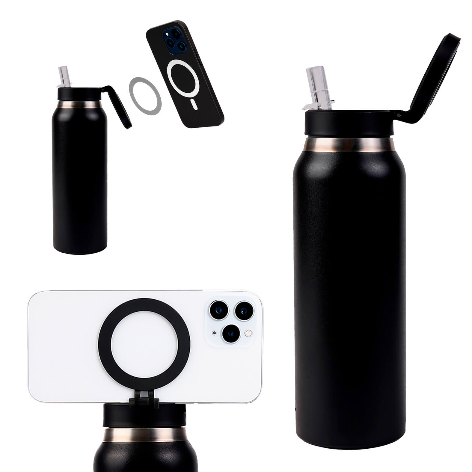 Termo con doble pared de acero inoxidable, insulado al vacio con acabado plastic painting. Cuenta con tapa enroscable con boquilla abatible, popote y asa con soporte magnetico para celular. Incluye aro metalico.