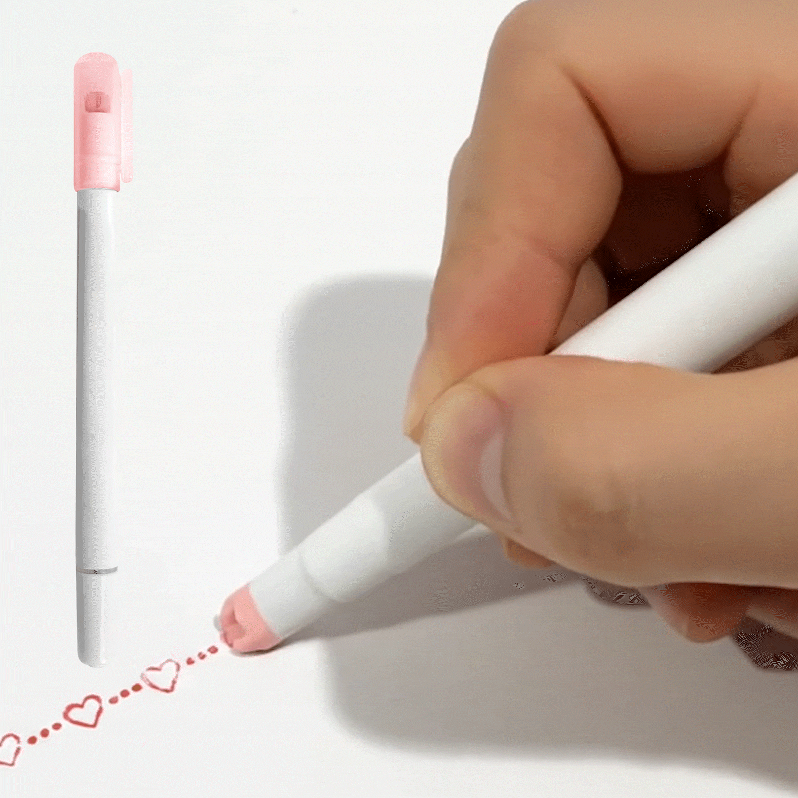 Bolígrafo de plástico con punta fina en el extremo inferior y sello de línea con figura de corazón en el extremo superior.