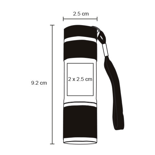 Lámpara metálica con 9 LEDS de luz blanca, con botón de encendido y apagado. Incluye correa de mano. Utiliza 3 baterías AAA ( no incluidas).