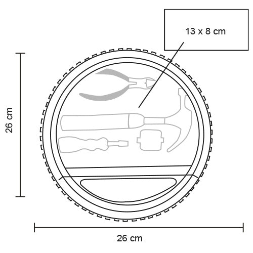 Set de herramientas en forma de llanta que incluye: 1 martillo, 1 pinza, 1 flexómetro, 1 destornillador y 2 juegos de 10 puntas.