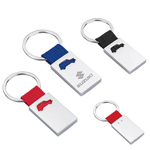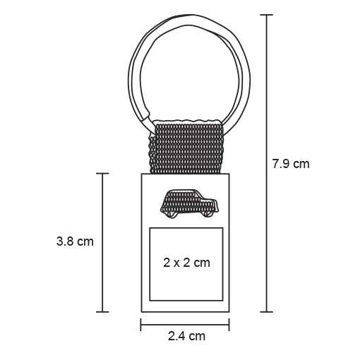 Llavero metálico con figura de auto y arillo reforzado.