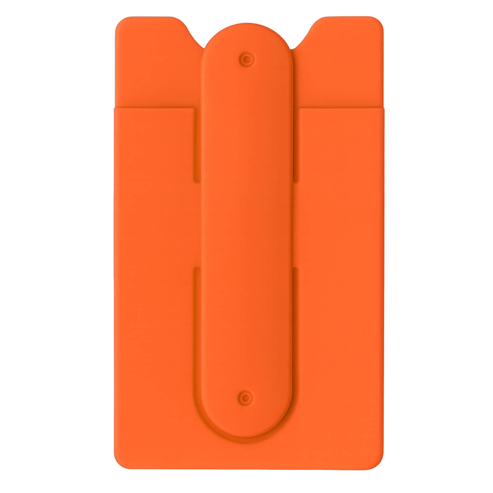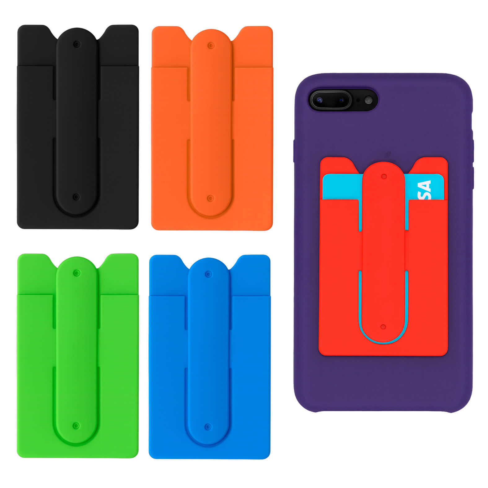 Porta tarjetero de silicón con clip retráctil que sirve como soporte para el celular y enrollar auriculares.