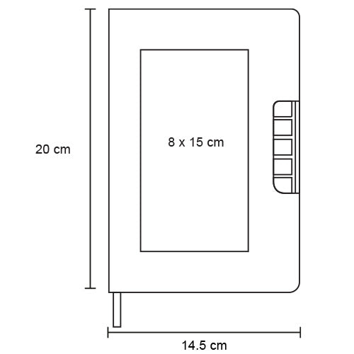 Libreta de poliuretano con 98 hojas rayadas, 5 banderas adhesivas, separador y banda elástica.