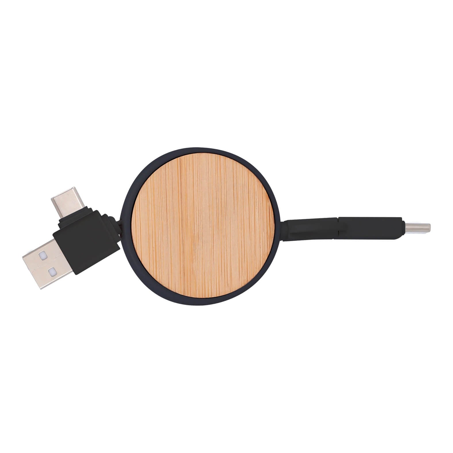 Cargador multifuncional circular con detalle de bambú, entrada tipo USB, tipo C, conector de salida tipo lightning y tipo C.
