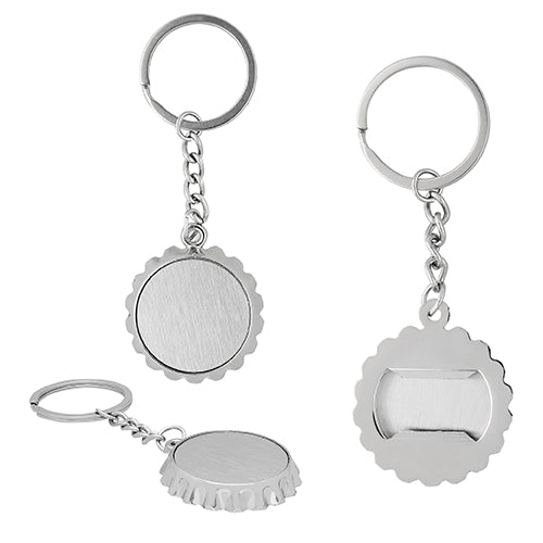 Llavero metálico destapador en forma de corcholata.