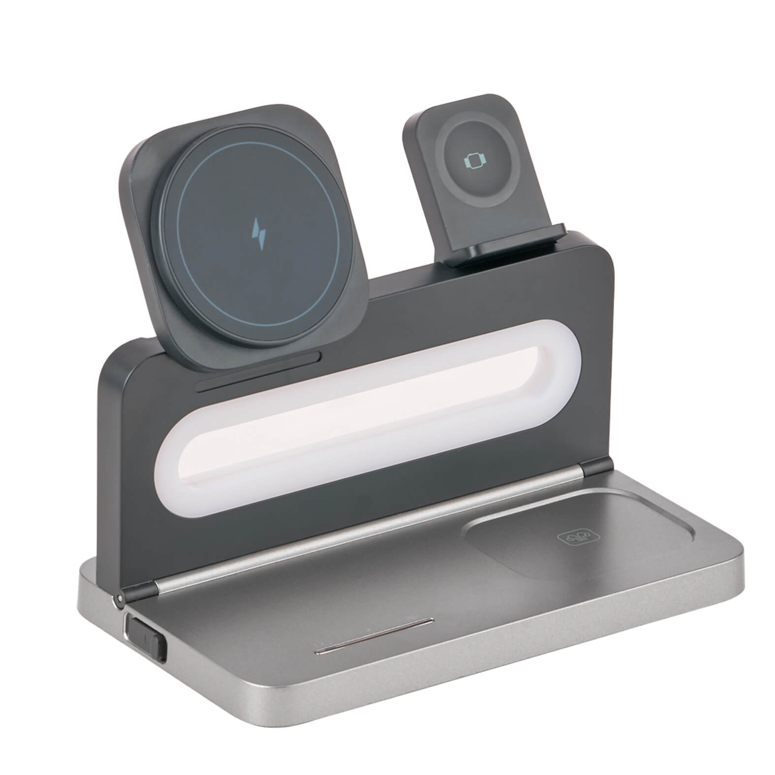 Multicargador inalámbrico plegable 3 en 1 para smartphone, audífonos y reloj inteligente. Incluye cable de carga Tipo C. (Compatible con dispositivos con tecnología Qi).