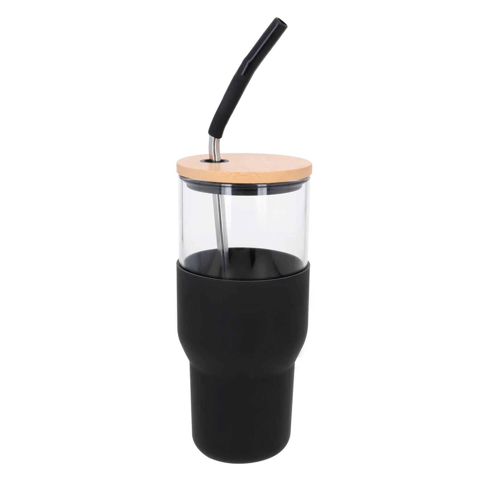 Cilindro de vidrio con funda de silicón, tapa de bambú con cierre a presión y popote metalico con boquilla de silicón.