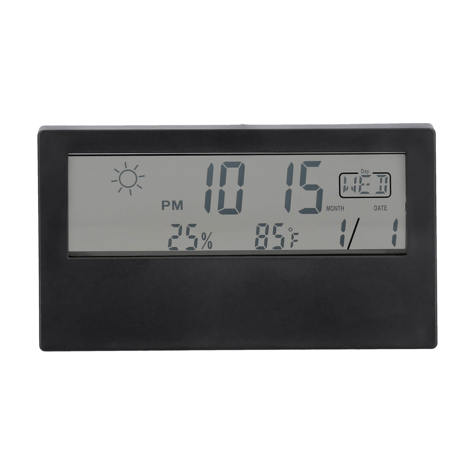 Reloj digital con despertador, medidor de temperatura, día, mes y año. Incluye baterias.