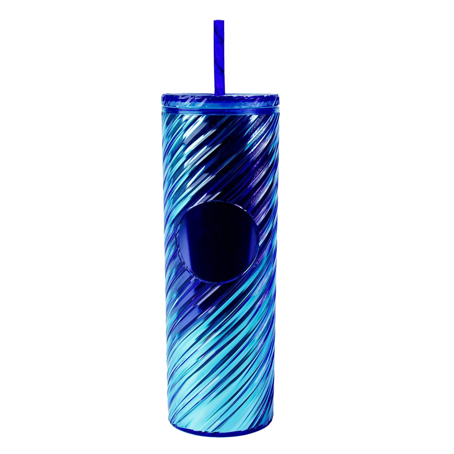 Termo de plástico con doble pared, tapa enroscable y popote de plástico.