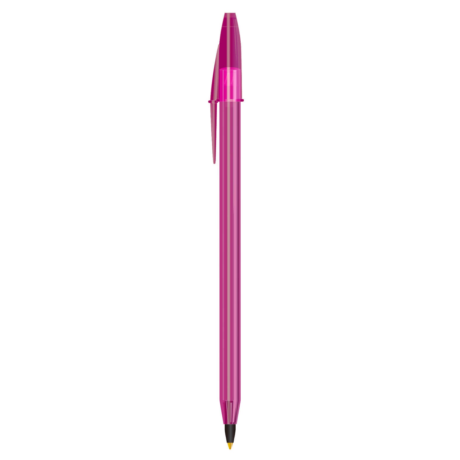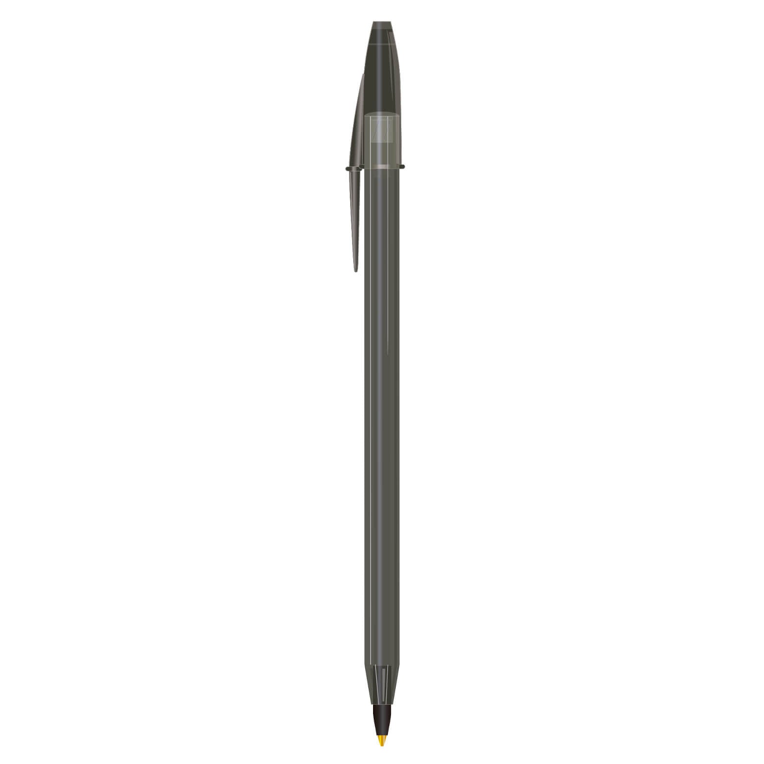 Bolígrafo de plástico traslúcido de punto mediano (1 mm) con tapa. La compra mínima es de 300 piezas y no se realizan ventas sin impresión.