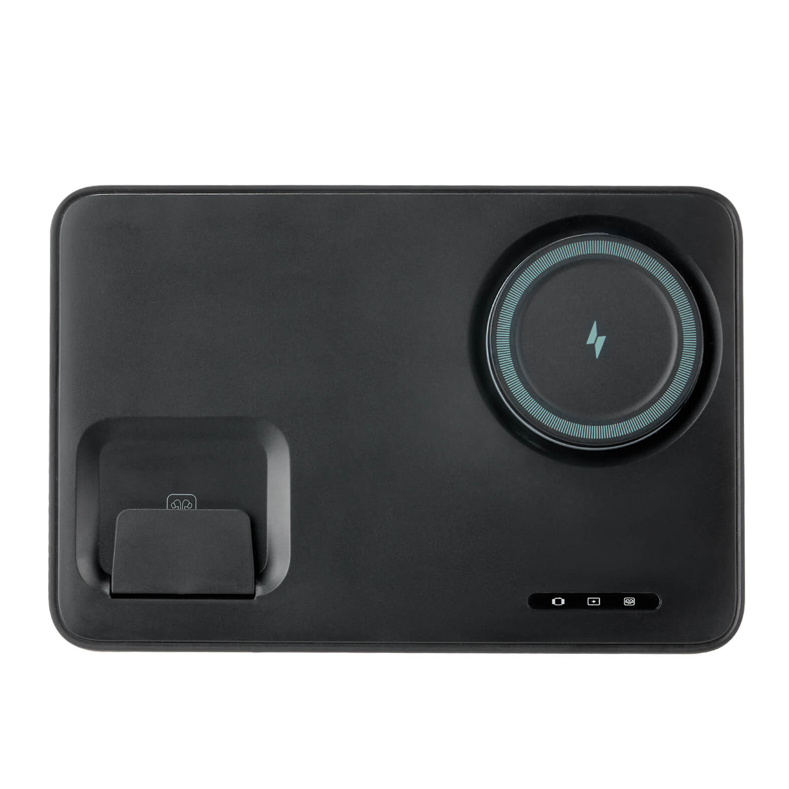 Multicargador inalámbrico 3 en 1 para smartphone, audífonos y reloj inteligente. Incluye cable de carga Tipo C. Compatible con dispositivos con tecnología Qi.