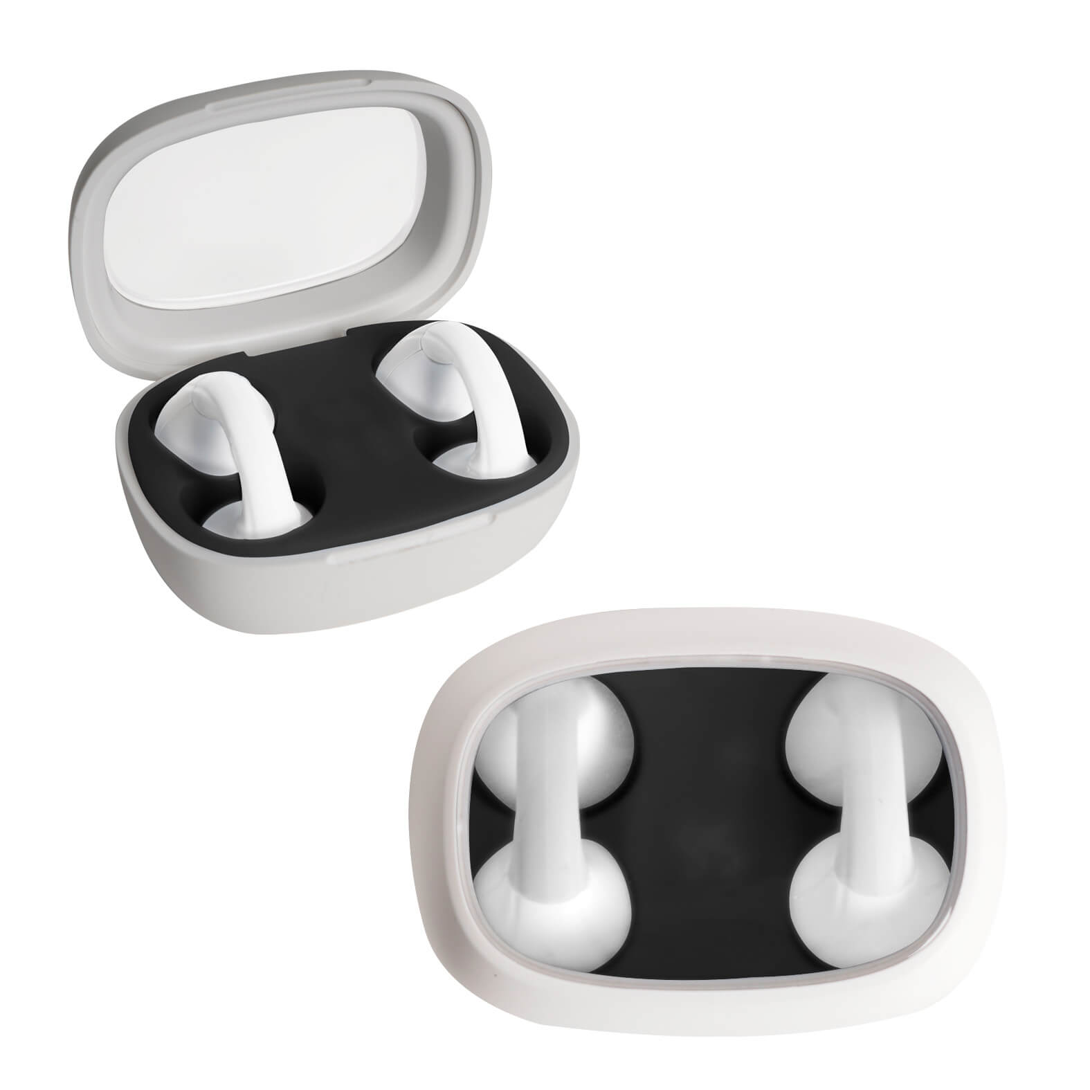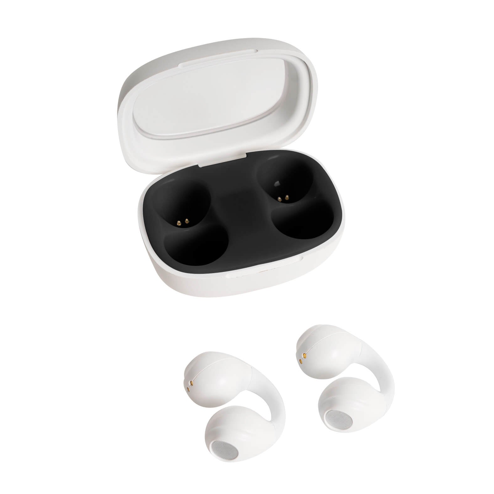 Audífonos inalámbricos con botones táctiles para pausar/reproducir, adelantar y retroceder. Incluye un estuche recargable con indicador de carga y entrada tipo C.