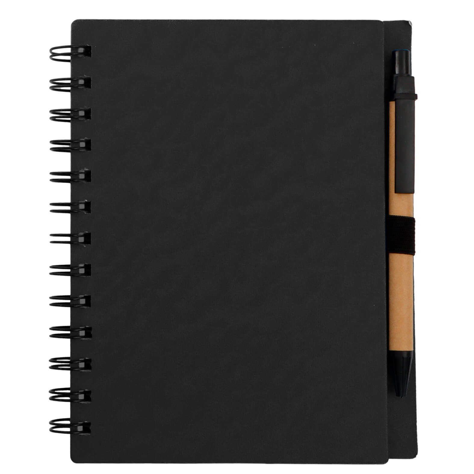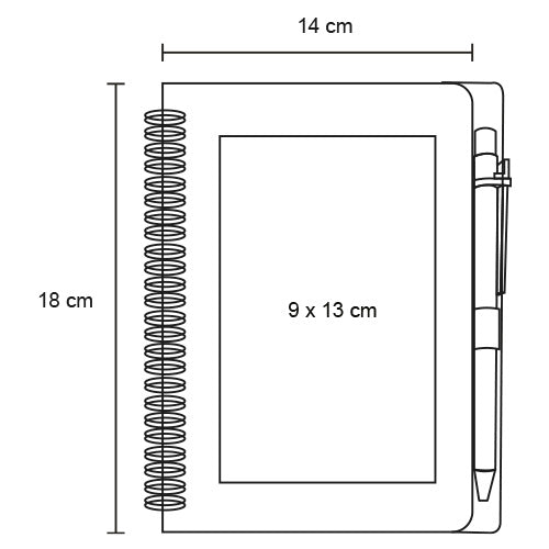 Libreta de cartón con espiral, 70 hojas y bolígrafo.